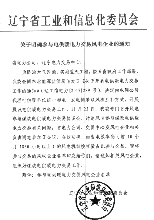 關(guān)于開展2017年遼寧省電供暖電力交易的通知