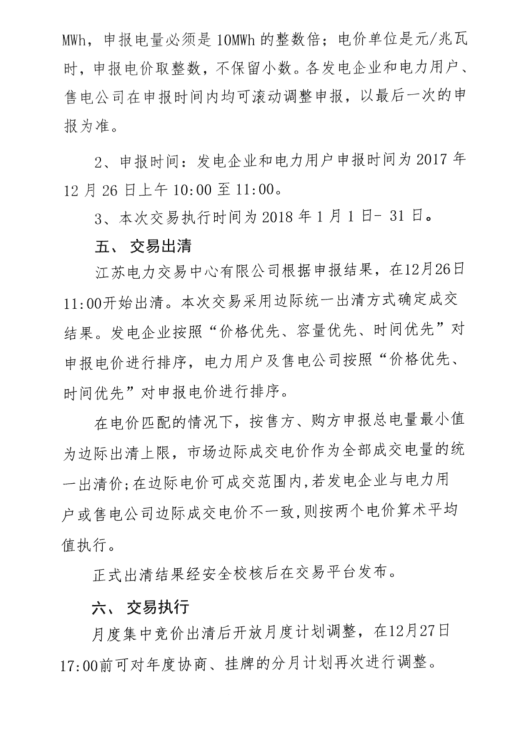 江蘇電力交易中心日前發(fā)布了《2018年1月份江蘇省電力集中競(jìng)價(jià)交易公告》,公告中稱,本次交易申報(bào)時(shí)間為發(fā)電企業(yè)和電力用戶為2017年12月26日上午10:00至11:00。