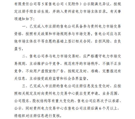 貴州電力交易中心日前公布了2017年12月納入貴州省電力市場(chǎng)主體目錄售電公司名單,貴州省益正電力有限責(zé)任公司等5家售電公司公示期滿無(wú)異議。詳情如下:
