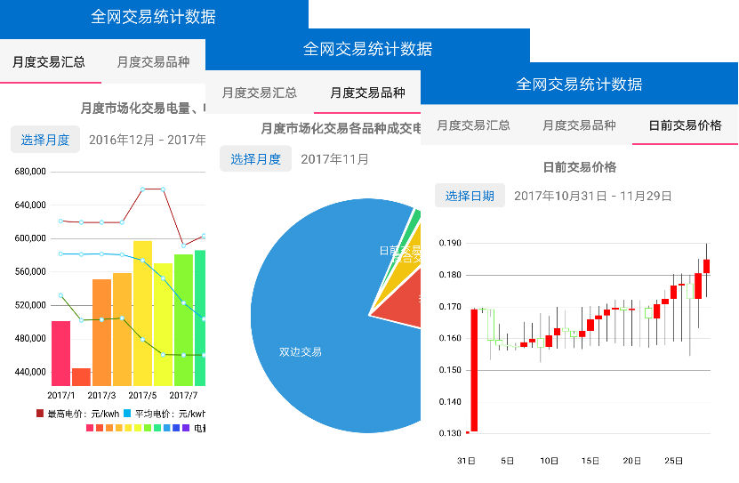 全網(wǎng)交易統(tǒng)計(jì)數(shù)據(jù)展示:提供包括月度量價(jià)數(shù)據(jù)、月度各交易品種分類統(tǒng)計(jì)及日前電量交易價(jià)格K線圖等市場(chǎng)交易數(shù)據(jù)展示;