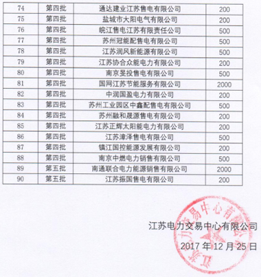 截止2017年12月25日10:00,江蘇電力交易中心共收到90家售電公司遞交的銀行履約保函。詳情如下: