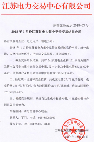 2018年1月江蘇省電力集中競價(jià)交易結(jié)果公示