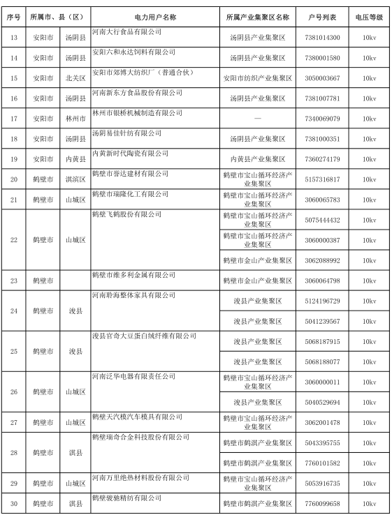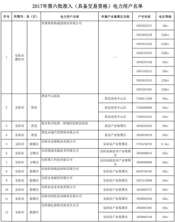 河南2017年第六批191家準(zhǔn)入(具備交易資格)電力用戶(hù)名單
