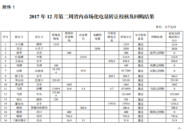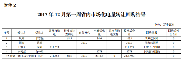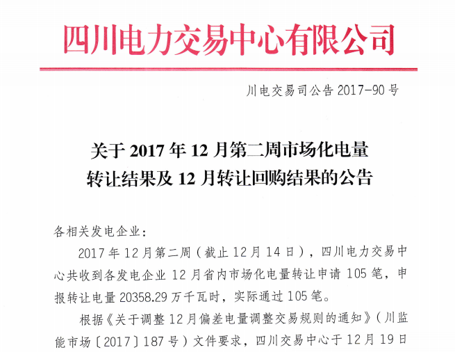 四川發(fā)布《關(guān)于2017年12月第二周市場(chǎng)化電量轉(zhuǎn)讓結(jié)果的公告》