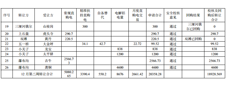 根據(jù)《關(guān)于調(diào)整12月偏差電量調(diào)整交易規(guī)則的通知》文件要求,四川交易中心于12月19日接收電廠12月已轉(zhuǎn)讓電量的回購申請(qǐng),共接受12月回購申請(qǐng)38筆,回購電量4025.67萬千瓦時(shí),其中12月第一周17筆,回購電量2895.95萬千瓦時(shí);第二周21筆,回購電量1429.72萬千瓦時(shí)。原文如下: