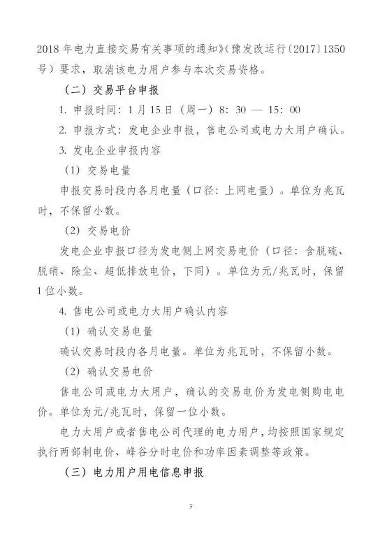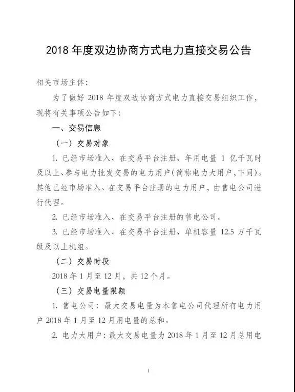 河南日前發(fā)布了《2018年度雙邊協(xié)商方式電力直接交易公告》,公告中稱,2018年度雙邊協(xié)商交易時(shí)段為:2018年1月至12月,共12個(gè)月。售電公司