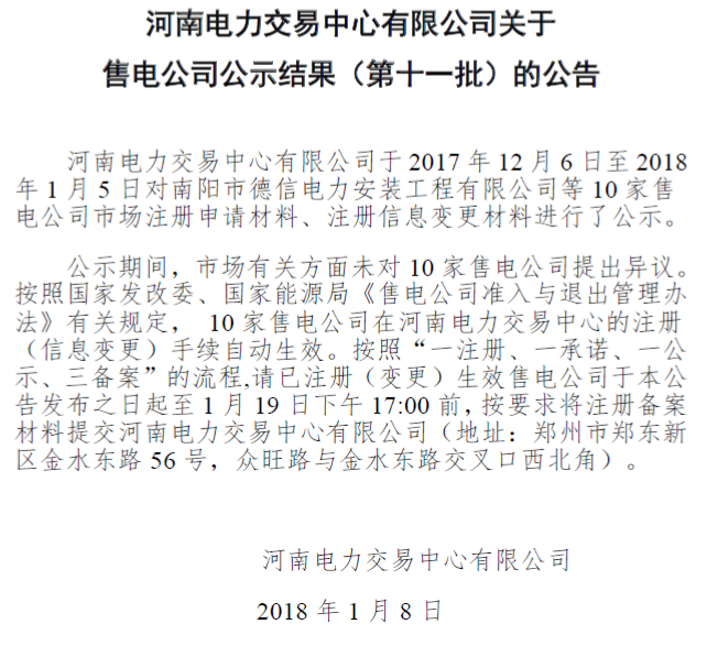 河南電力交易中心于2017年12月6日至2018年1月5日對10家售電公司市場注冊申請材料、注冊信息變更材料進(jìn)行公示。