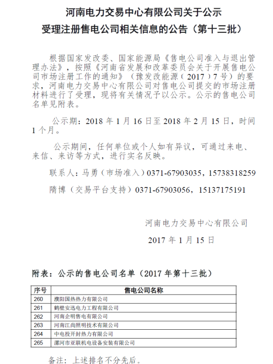 河南電力交易中心日前發(fā)布了關(guān)于公示受理注冊售電公司相關(guān)信息的公告(第十三批),本批次共公示6家售電公司,公示期為2018年1月16日至2018年2月15日,詳情如下: