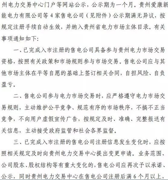 貴州電力交易中心日前發(fā)布貴州省四家售電公司注冊手續(xù)自動生效,原文如下:《關(guān)于公布2018年1月納入貴州省電力市場主體目錄售電公司名單的