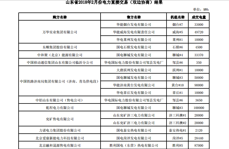 《山東省2018年2月份電力直接交易(雙邊協(xié)商)結(jié)果》