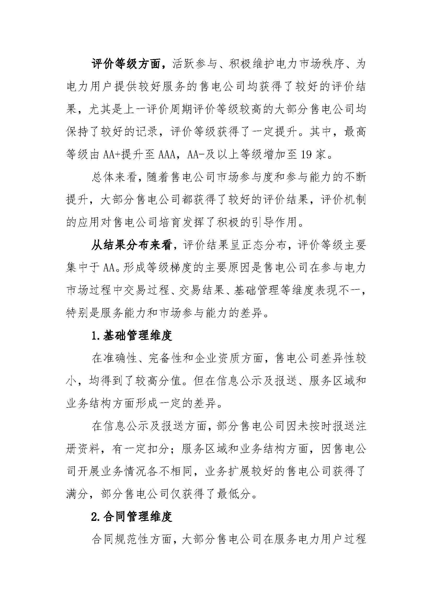 從結果公布來看,評價結果呈正態(tài)分布,評價等級主要集中于AA。形成等級梯度的主要原因是售電公司在參與電力市場過程中交易過程、交易結果、基礎管理等維度表現(xiàn)不一,特別是服務能力和市場參與能力的差異。