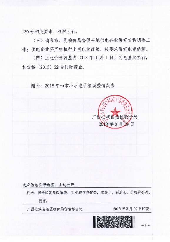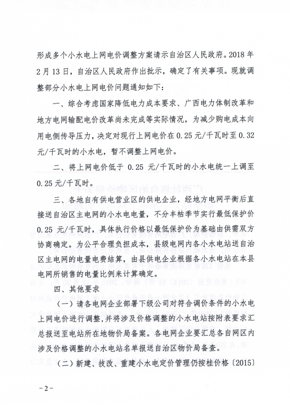 廣西物價局日前發(fā)布了《關(guān)于調(diào)整部分小水電上網(wǎng)電價的通知》,通知中稱,決定對上網(wǎng)電價低于0 25元 千瓦時的小水電統(tǒng)一上調(diào)至0 25元,現(xiàn)行