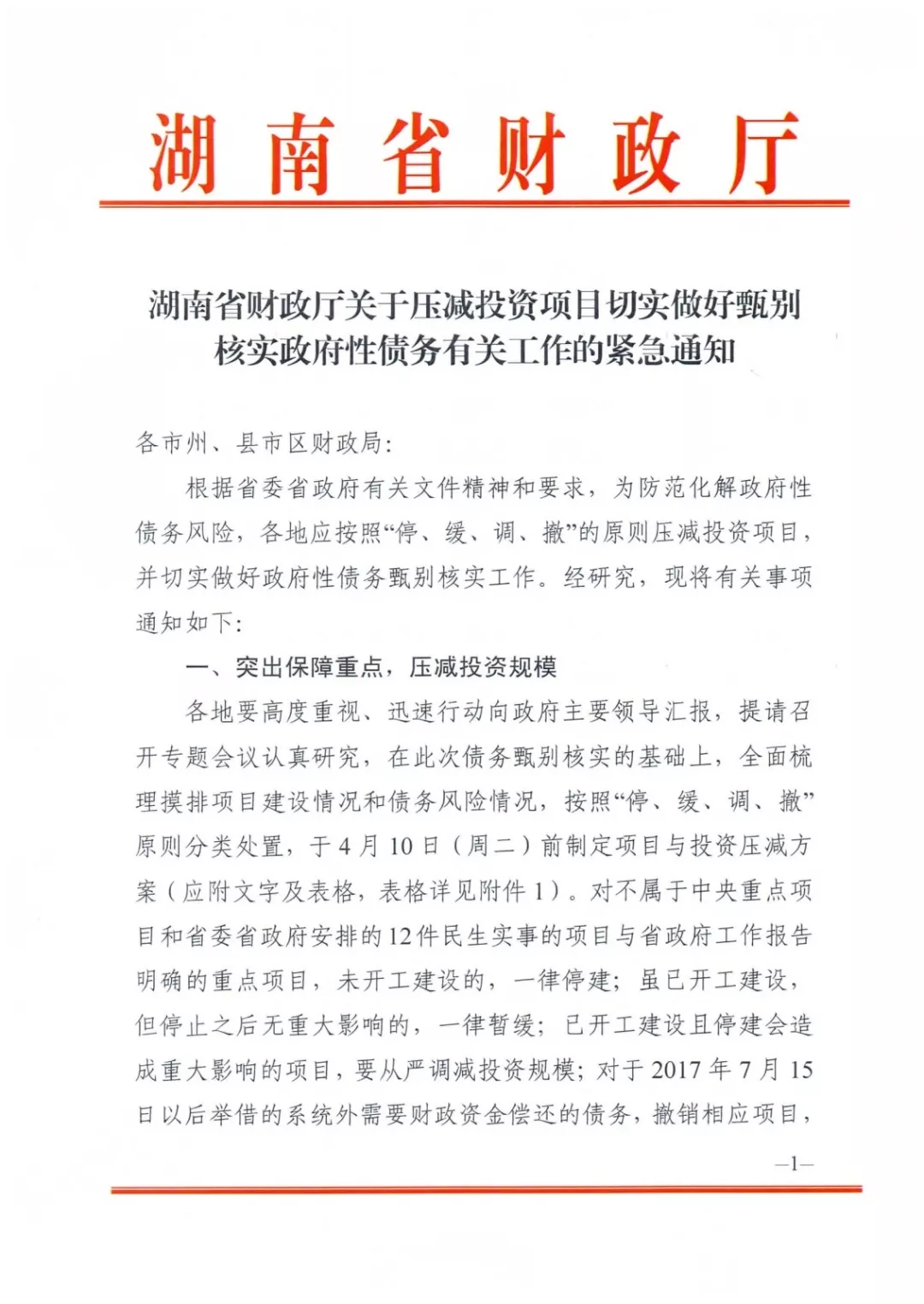 剛剛,湖南省財政廳發(fā)布緊急通知,要求各地應(yīng)按照“停、緩、調(diào)、撤”的原則壓減投資項目。