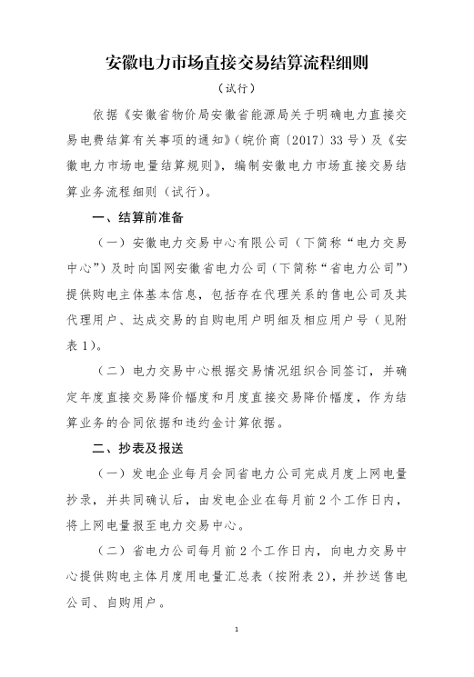 附件:安徽電力交易中心有限公司關(guān)于發(fā)布《安徽電力市場直接交易結(jié)算流程細(xì)則(試行)的公告 皖電交易綜〔2017〕1號