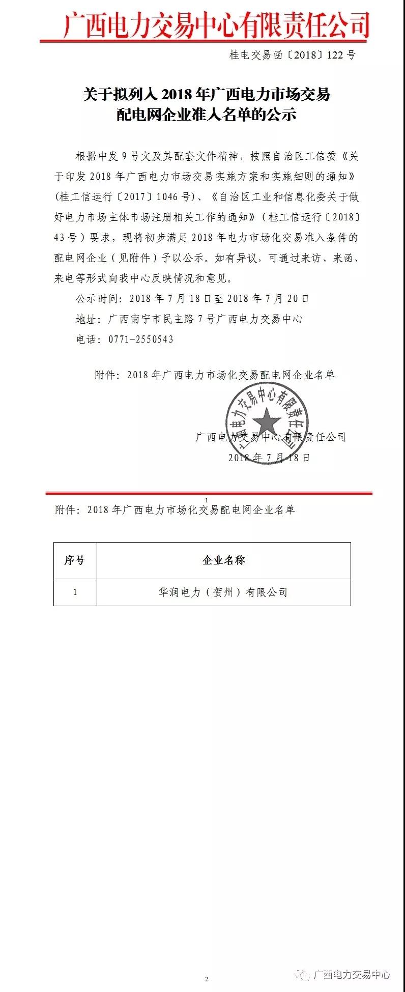 關(guān)于擬列入2018年廣西電力市場交易配電網(wǎng)企業(yè)準入名單的公示