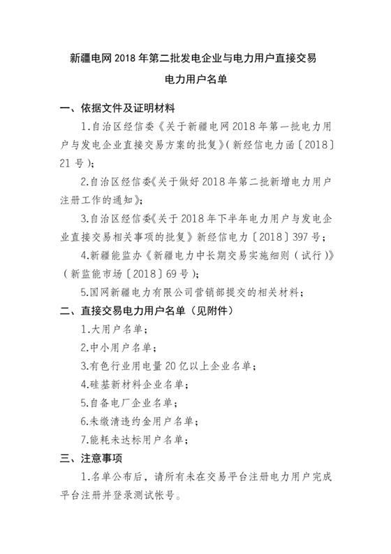 新疆電網(wǎng)2018年第二批發(fā)電企業(yè)與電力用戶直接交易電力用戶名單