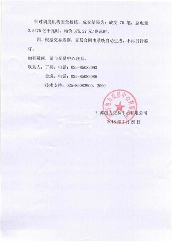 江蘇2018年7月月內(nèi)增量掛牌交易及購電側(cè)月合同電量轉(zhuǎn)讓交易結(jié)果