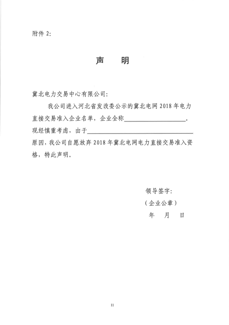 3、對于因特殊情況放棄直接交易資格的用戶,應(yīng)要求其配合完成“聲明”(附件2),并將電子版掃描件發(fā)至冀北交易中心內(nèi)網(wǎng)郵箱(見下文),紙質(zhì)材料各地市供電公司留存?zhèn)洳椤?/p>