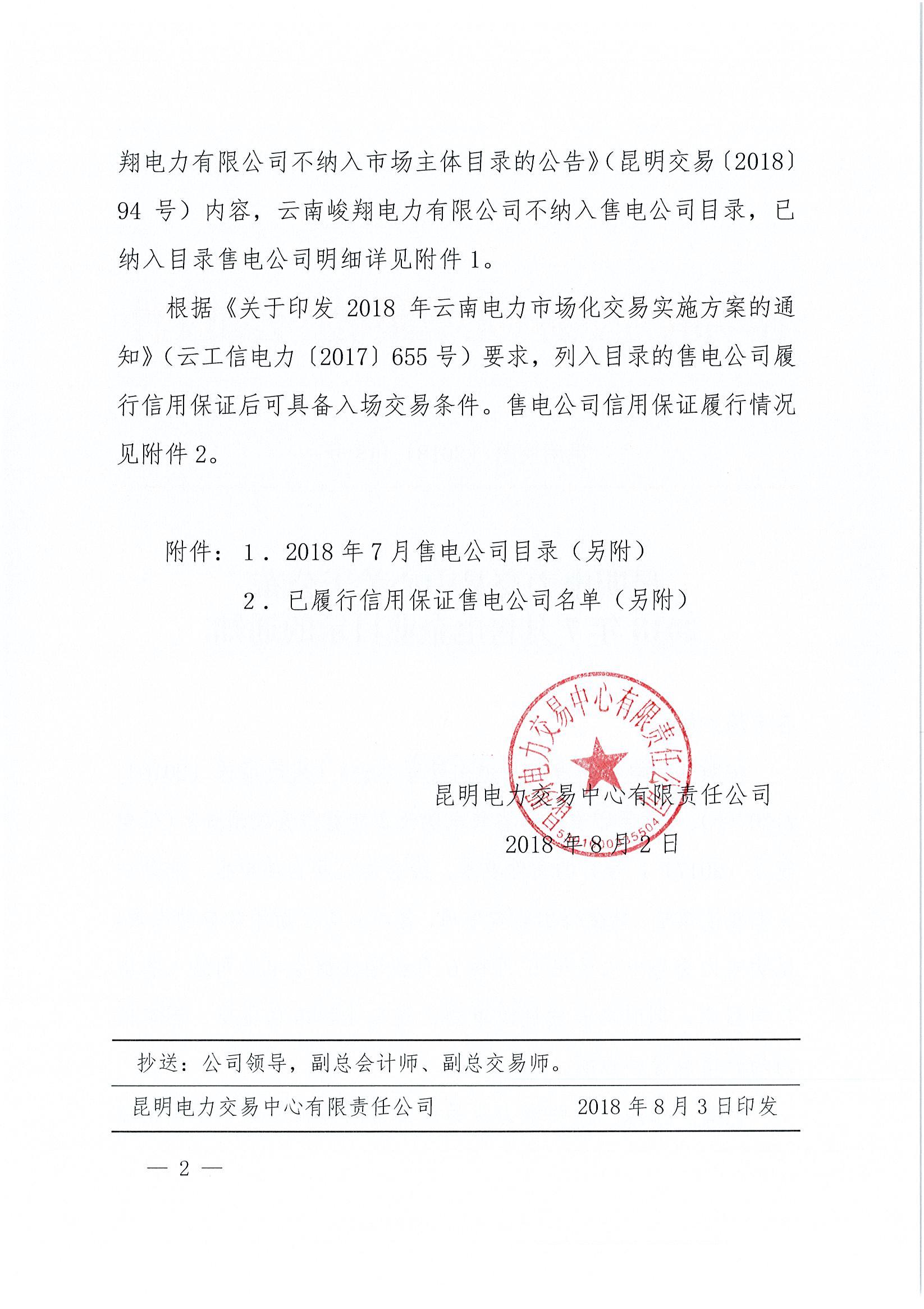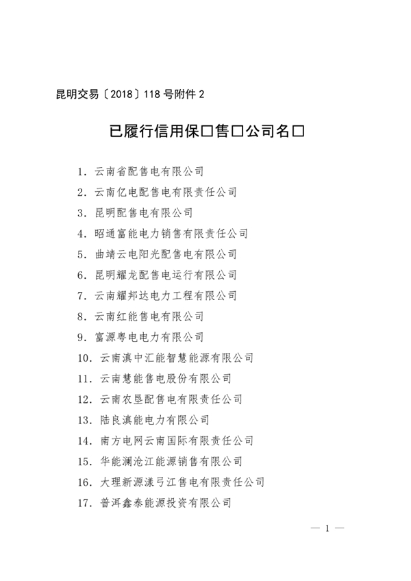 根據(jù)《關(guān)于印發(fā)208年云南電力市場(chǎng)化交易實(shí)施方案的通知》(云工信電力(2017)655號(hào))要求,列入目錄的售電公司履行信用保證后可具備入場(chǎng)交易條件。售電公司信用保證履行情況見(jiàn)附件2。詳情如下: