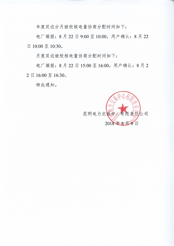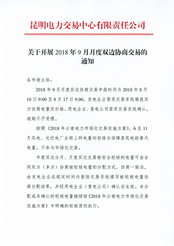 昆明電力交易中心日前發(fā)布了《關(guān)于開展2018年9月月度雙邊協(xié)商交易的通知》,2018年9月月度雙邊協(xié)商交易申報時間為2018年8月10日9:00至月17