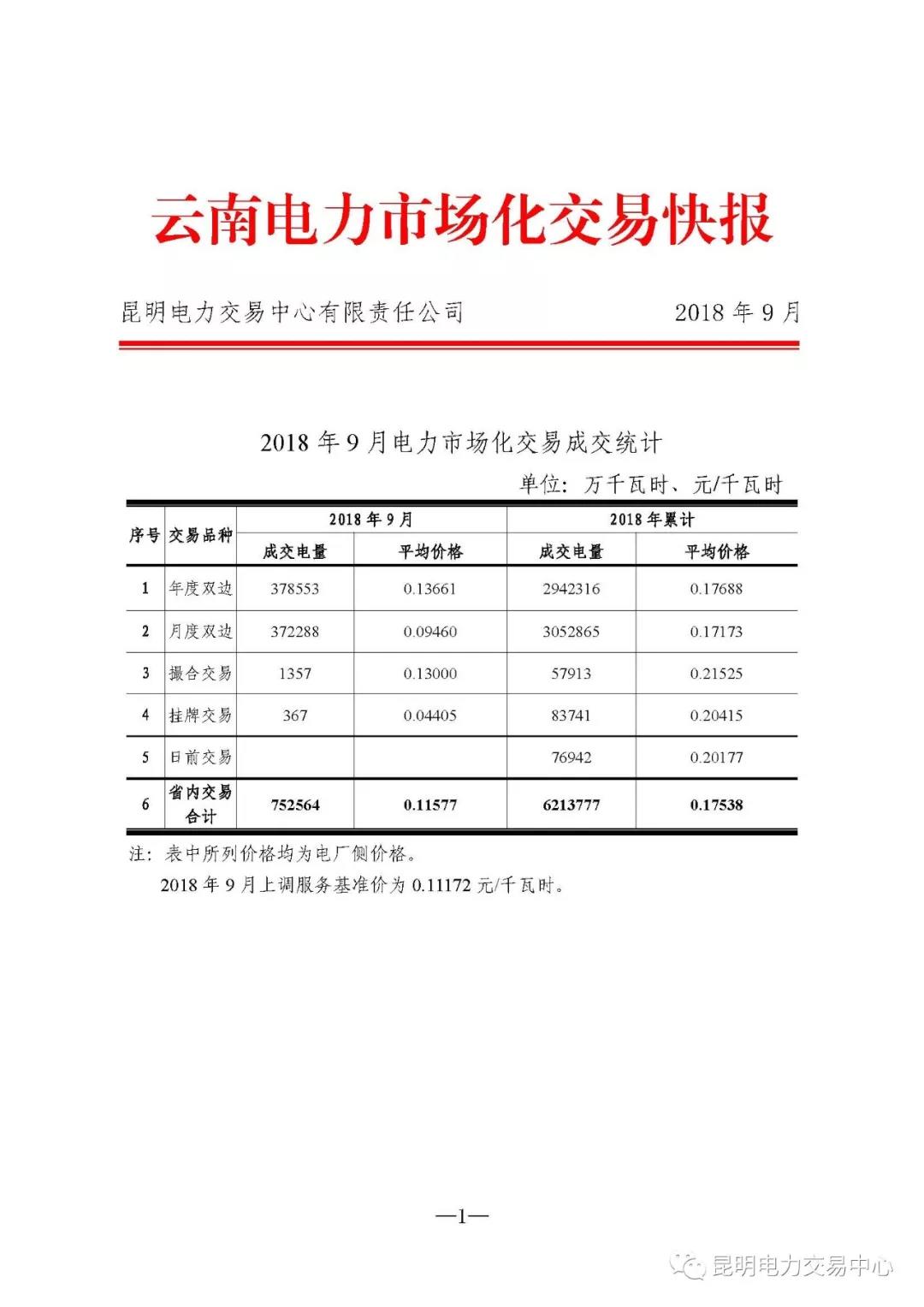 云南電力市場化交易快報(2018年9月)