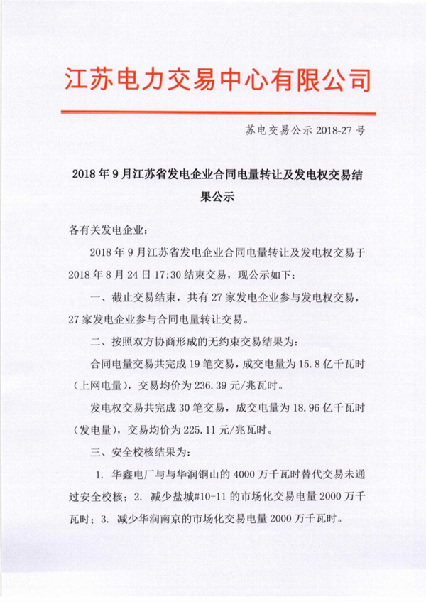江蘇2018年9月發(fā)電企業(yè)合同電量轉(zhuǎn)讓及發(fā)電權(quán)交易結(jié)果
