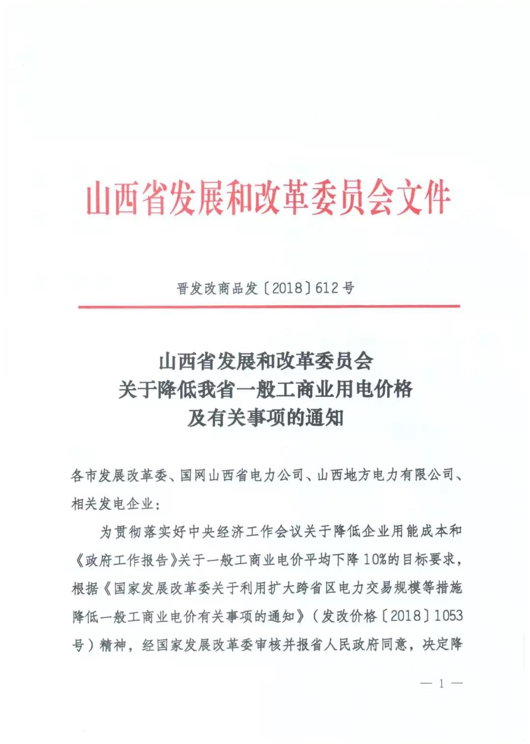 山西省發(fā)改委發(fā)布《關(guān)于降低我省一般工商業(yè)用電價(jià)格及有關(guān)事項(xiàng)的通知》