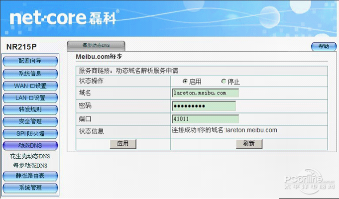 然后下載其客戶端,由于NR215P內嵌了每步動態(tài)域名服務,所以可以不用下載其客戶端。在NR215P操作界面中動態(tài)DDNS(每步動態(tài)DDNS)中填入你注冊的域名:
