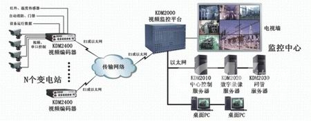 每個(gè)變電站根據(jù)需要設(shè)立視頻監(jiān)控點(diǎn),可以部署1臺(tái)或者多臺(tái)KDM2400視頻編碼器,每臺(tái)KDM2400可以同時(shí)接入4臺(tái)攝像機(jī)。除了提供視頻編碼功能外,KDM2400還提供RS232/422/485串口,可支持透明串口功能,用于遠(yuǎn)程控制攝像機(jī)云臺(tái)或采集設(shè)備運(yùn)行數(shù)據(jù);提供4路電平輸入和3路電平輸出,實(shí)現(xiàn)紅外、溫感、煙感等告警信號(hào)的輸入和反向控制或聯(lián)動(dòng)信號(hào)的輸出;提供1路E1接口和1路10/100M以太網(wǎng)接口,可根據(jù)具體傳輸線路的情況選擇不同的接入方式與監(jiān)控中心互聯(lián)。