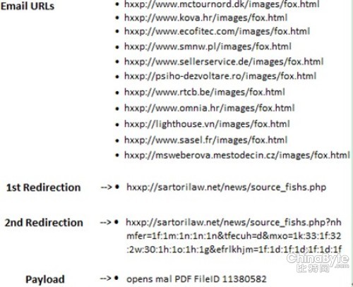 這些電子郵件中往往包含一系列可以重定向的鏈接,將用戶引至提供惡意PDF文件的BlackHole漏洞利用工具包。一旦此惡意PDF文件被打開,就會執(zhí)行可以提供“CVE-2010-0188”漏洞的嵌入混淆JavaScript代碼。在被成功入侵的電腦上,shellcode會從以下網(wǎng)址下載一個(gè)惡意組件: