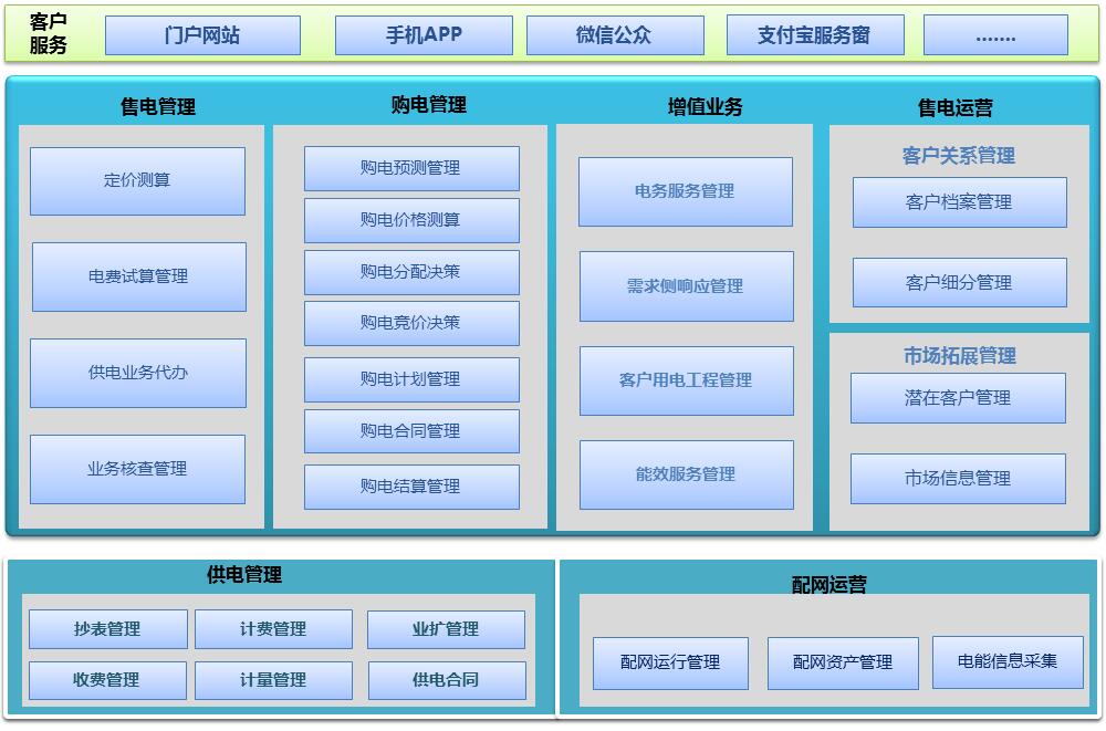 6、供電管理:為園區(qū)微電網(wǎng)售電公司提供用電用戶業(yè)擴(kuò)報(bào)裝、抄核收等傳統(tǒng)營(yíng)銷業(yè)務(wù)管理。