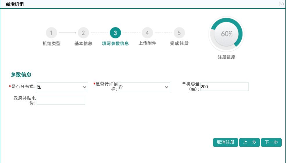 上傳注冊(cè)機(jī)組所需要的附件信息(附件類(lèi)型必須為pdf格式),然后點(diǎn)擊“下一步”完成此機(jī)組的注冊(cè)(每個(gè)機(jī)組必傳電價(jià)批復(fù)文件和建設(shè)核準(zhǔn)文件)。