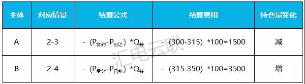 情景2:假設(shè)售電公司A將其持有的100MWh原始價(jià)格為300元/MWh的購(gòu)電合約以315元/MWh元轉(zhuǎn)讓給售電公司B。實(shí)際發(fā)生的日前綜合電價(jià)為350元/MWh。該示例對(duì)應(yīng)表格中的2-3,2-4情景,查詢對(duì)應(yīng)公式,其結(jié)算如下: