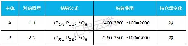情景3:假設(shè)發(fā)電企業(yè)A將其持有的400MW中的100MWh,原始價(jià)格為400元/MWh的發(fā)電合約以380元/MWh轉(zhuǎn)讓給售電公司B。實(shí)際發(fā)生的日前綜合電價(jià)為350元/MWh。該示例對(duì)應(yīng)表格中的1-1,2-2情景,查詢對(duì)應(yīng)公式,其結(jié)算如下: