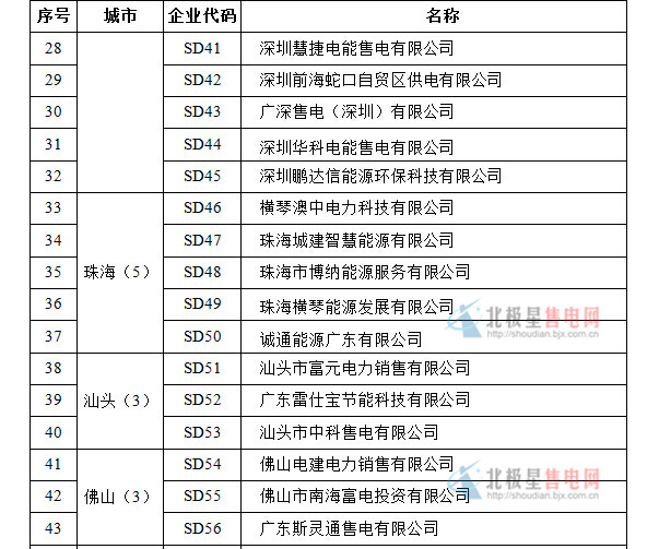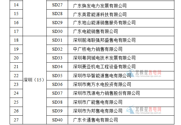 廣東粵電電力銷售有限公司、華能廣東能源銷售有限責任公司、華潤電力(廣東)銷售有限公司、中電投(深圳)電力銷售有限公司、深圳能源售電有限公司、廣州發(fā)展電力銷售有限公司、新奧(廣東)能源銷售有限公司、廣東華廈電力銷售有限公司、肇慶大旺電力熱力有限公司、廣州恒運綜合能源銷售有限公司、深圳深電能售電公司、深圳兆能供電服務公司、廣州穗開電業(yè)有限公司