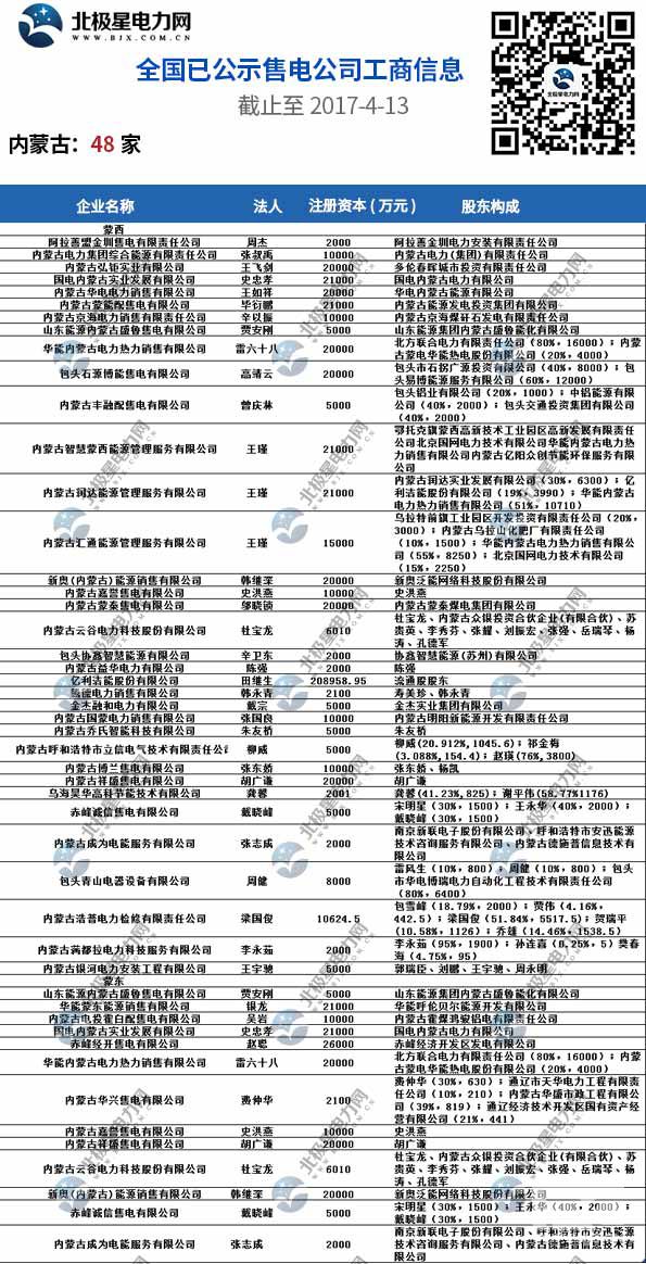 全國已公示1371家售電公司名單(截止2017-4-13)