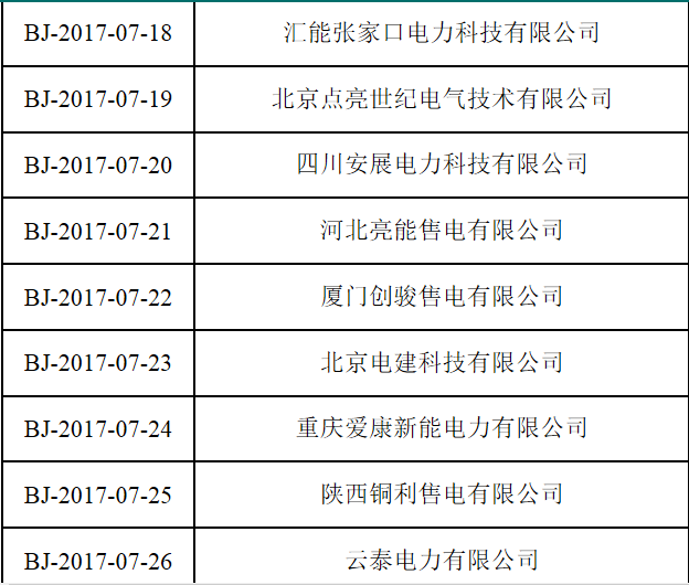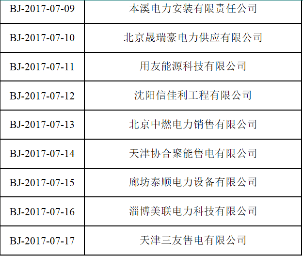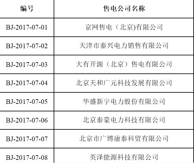 按照國家發(fā)改委、國家能源局《售電公司準(zhǔn)入與退出管理辦法》的要求,北京電力交易中心受理了下列售電公司的注冊申請,對售電公司提交的市場準(zhǔn)入申請材料進(jìn)行了完整性核驗(yàn),現(xiàn)將企業(yè)名單及基本情況予以公示。