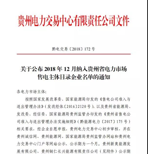 貴州關(guān)于公布2018年12月納入貴州省電力市場售電主體目錄企業(yè)名單的通知