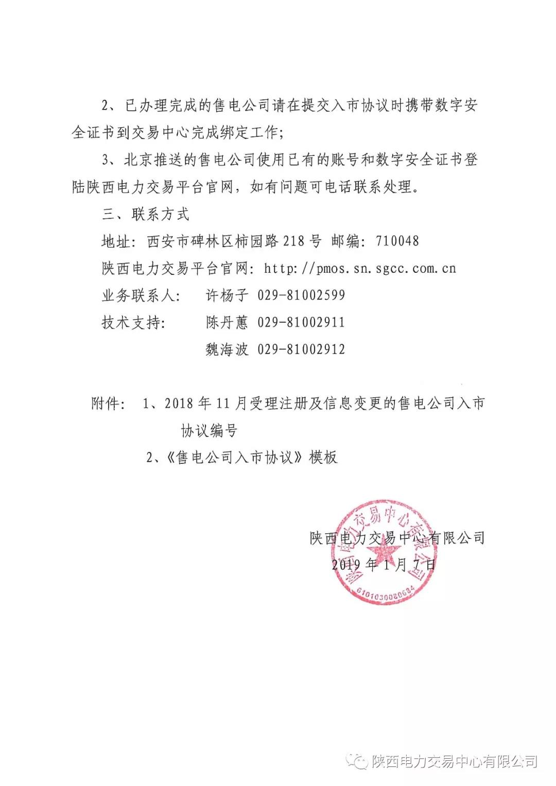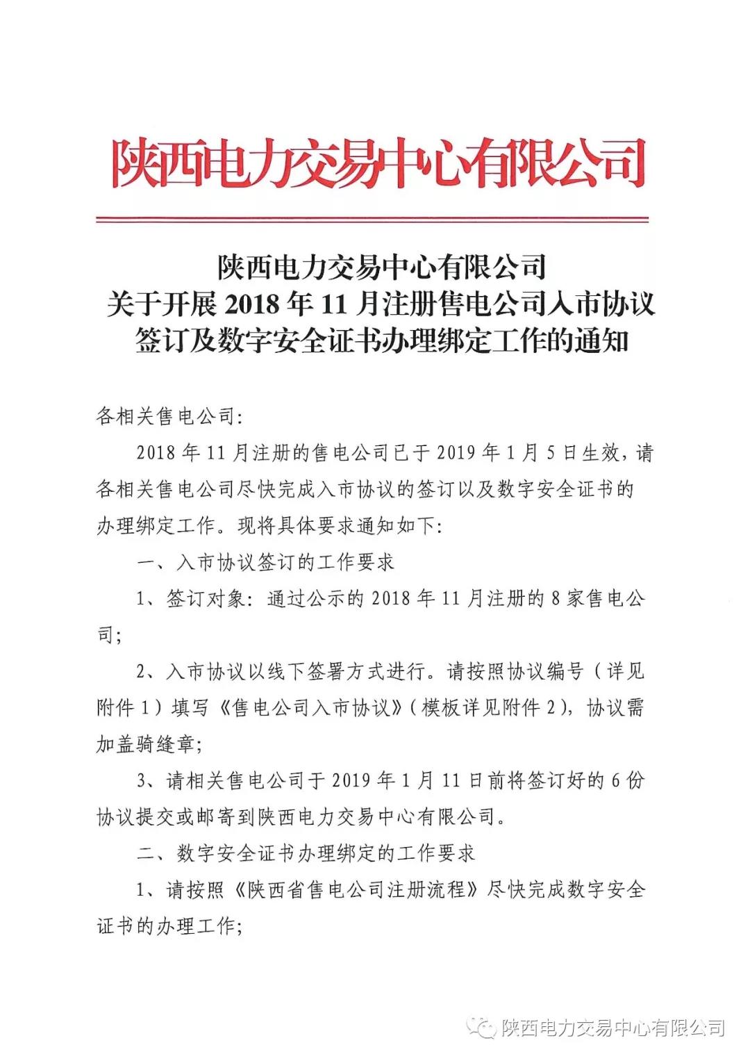 陜西關于開展2018年11月注冊售電公司入市協(xié)議簽訂及數字安全證書辦理綁定工作的通知