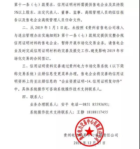 貴州電力交易中心日前發(fā)布了《關于開展售電企業(yè)完善信用證明材料專項工作的通知》,于2019年1月1日起,未按相關規(guī)定提供完整合規(guī)信用證明材料售電企業(yè),暫停開展市場化交易業(yè)務。