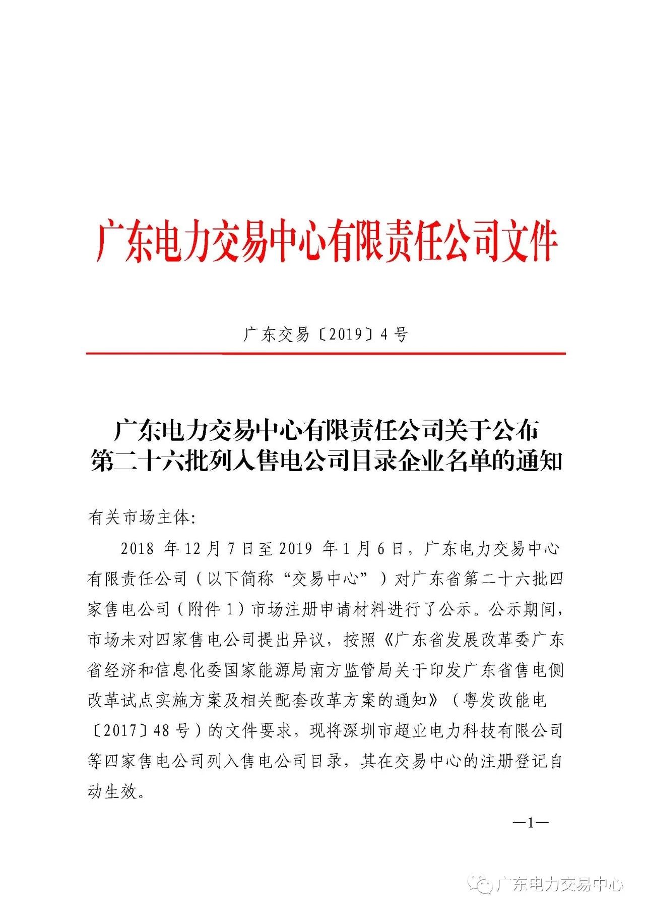 廣東電力交易中心日前發(fā)布了《關于公布第二十六批列入售電公司目錄企業(yè)名單的通知》,深圳市超業(yè)電力科技有限公司等第二十六批4家售電公司注冊手續(xù)生效。