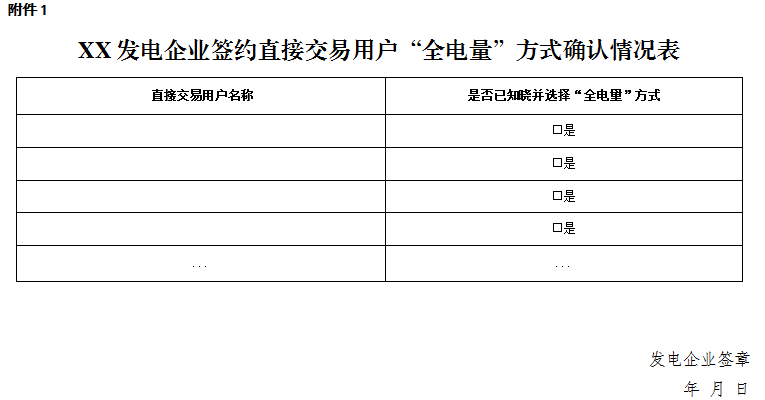 附件:1.XX發(fā)電企業(yè)簽約直接交易用戶“全電量”方式確認(rèn)情況表