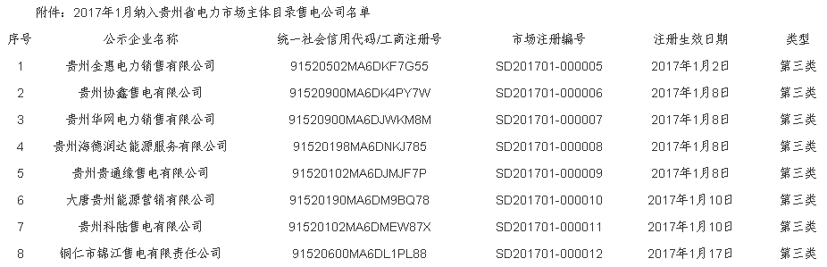 關(guān)于公布2017年1月納入貴州省電力市場(chǎng)主體目錄售電公司名單的通知