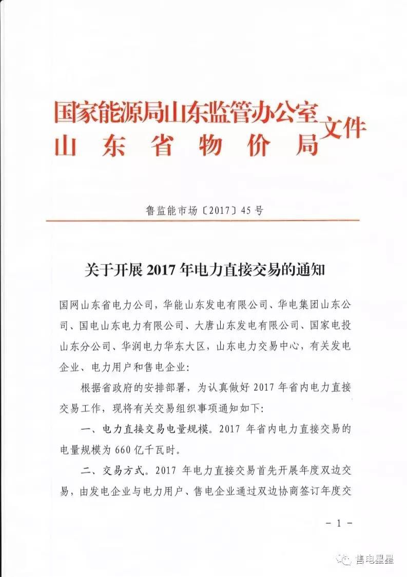 近日,國家能源局山東監(jiān)管辦公室、山東省物價(jià)局聯(lián)合發(fā)布了《關(guān)于開展2017年電力直接交易的通知》。通知顯示發(fā)電企業(yè)與電力用戶、售電企業(yè)可通過雙邊協(xié)商簽訂年度交易意向書,售電公司在山東正式入場可以參與直接