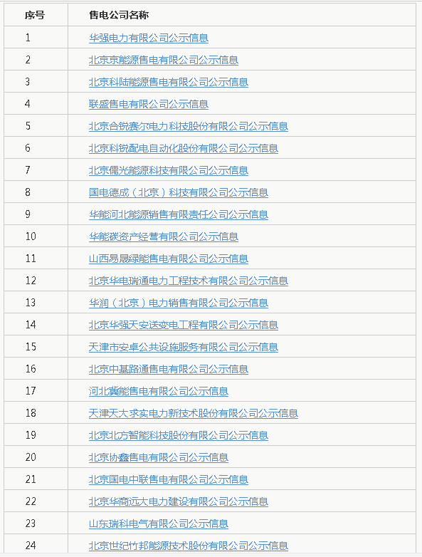 公示期間,任何單位和個人如有異議,可通過來電、來信、來訪等方式向北京電力交易中心實名反映。本次公示售電公司目錄如下: