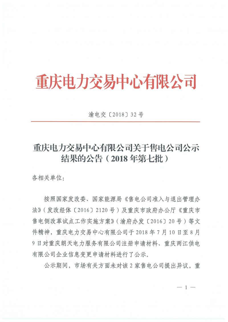重慶電力交易中心日前發(fā)布了《關(guān)于售電公司公示結(jié)果的公告(2018年第七批)》,重慶電力交易中心有限公司于2018年7月10日至8月9日對(duì)重慶朗天...