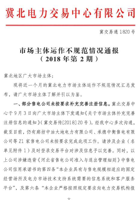 冀北電力市場主體運(yùn)作不規(guī)范情況通報(bào)(2018年第2期):21家售電公司未按要求補(bǔ)充完善注冊(cè)信息