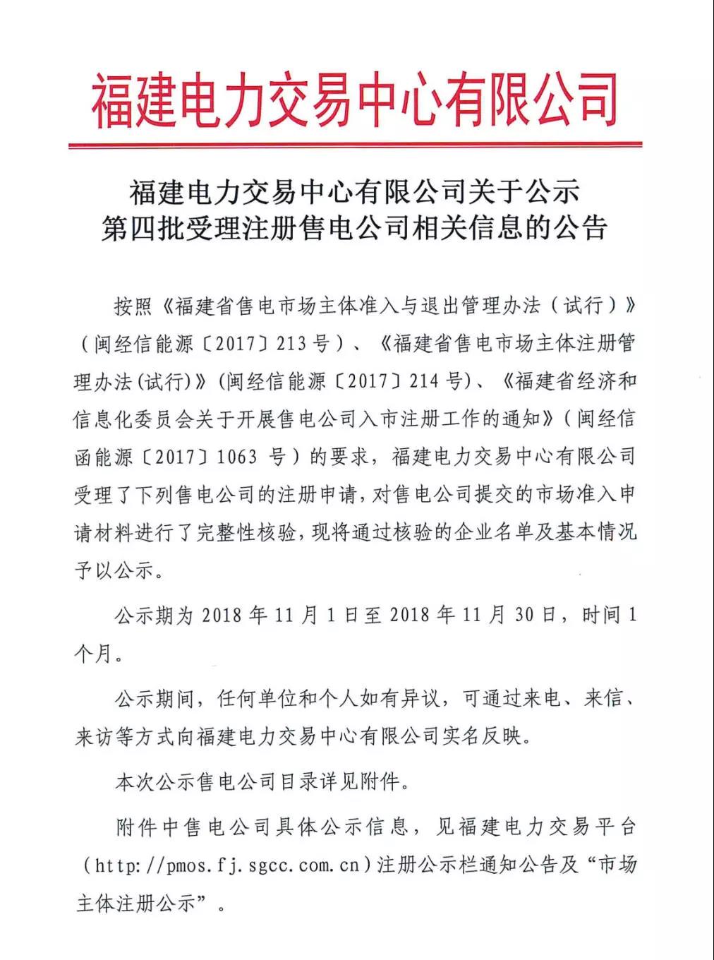 福建電力交易中心有限公司關(guān)于公示第四批受理注冊售電公司相關(guān)信息的公告