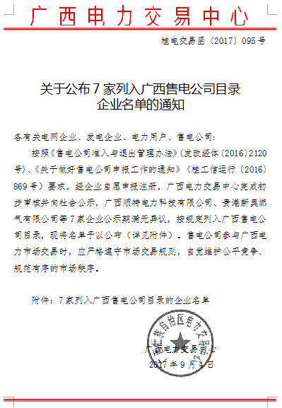 附件1:關(guān)于公布7家列入廣西售電公司目錄企業(yè)名單的通知