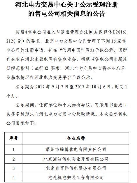 2017年9月7日,河北電力交易中心發(fā)布《河北電力交易中心關(guān)于公示受理注冊(cè)的售電公司相關(guān)信息的公告》。公告中稱,對(duì)于河北電力交易中心受理的石家莊雙鳳安裝工程有限公司等9家售電公司,以及對(duì)北京電力中心受理并